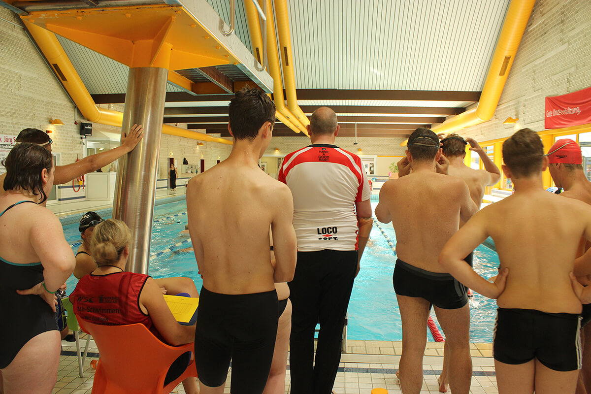 Ziel der Staffelwettbewerbe ist es, in einem Team von maximal 10 Personen so viele Meter wie möglich innerhalb von 60 Minuten zurückzulegen. Lautstark angefeuert von Firmengründer Dipl.-Ing. Wolfgang Börsch wurde am Sonntagmorgen die Loco-Soft Staffel gegen die Kreissparkasse Köln (KSK) ins Becken geschickt. Es kam zu einem spannenden Kopf-an-Kopf-Rennen gegen die Auswahl der Kreissparkasse, bei dem letztlich beide Mannschaften nach 4.400 Metern ins Ziel kamen und sich somit in der Kategorie „Sportverein / Firma / Hobbygruppe“ den zweiten Platz unter neun Mitstreitern teilten. Nur die Auswahl der LANG AG war mit 5.000 Metern nicht mehr zu schlagen.